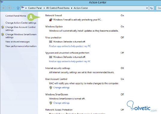 - [color=#008000]A -[/color] Action Center nos muestra un resumen de todos los ajustes de seguridad de nuestro sistema.