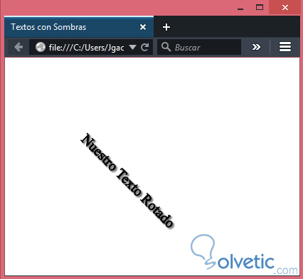 <!DOCTYPE html><html lang="es"><head> <meta charset="UTF-8"> <title>Textos con Sombras</title></head><body> <p></p> <canvas id="sombra"></canvas> <script type="text/javascript"> var canvas = document.getElementById('sombra'); var ctx = canvas.getContext('2d'); canvas.width=250; canvas.height=250; ctx.shadowOffsetX = 2; ctx.shadowOffsetY = 2; ctx.shadowBlur = 2; ctx.shadowColor = "rgba(0, 0, 0, 0.5)"; ctx.font = "20px Times New Roman"; ctx.fillStyle = "Black"; ctx.rotate(Math.PI/4,0,0); ctx.fillText("Nuestro Texto Rotado", 140, 1); ctx.strokeText("Nuestro Texto Rotado", 140, 1); </script></body></html>Como podemos apreciar hay unas diferencias respecto al ejemplo anterior, en primer lugar estamos definiendo un nuevo tamaño para nuestro canvas, esto es con la finalidad que nuestro canvas original no se deforme debido al tamaño por defecto que tiene, luego aplicamos el método rotate a nuestro objeto de contexto y finalmente luego de dibujar el texto inicial, al rotar hay que volver a dibujarlo para que se muestre, por ello utilizamos el método strokeText.Una vez hecho todo el proceso obtendremos el siguiente resultado al ejecutar nuestra página en el navegador: