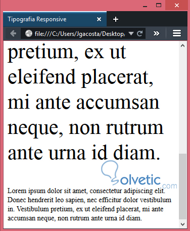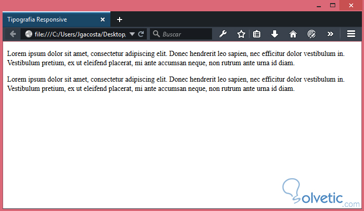 <!DOCTYPE html><html lang="es"><head> <meta charset="UTF-8"> <title>Tipografia Responsive</title></head><body> <p class="primera"> Lorem ipsum dolor sit amet, consectetur adipiscing elit. Donec hendrerit leo sapien, nec efficitur dolor vestibulum in. Vestibulum pretium, ex ut eleifend placerat, mi ante accumsan neque, non rutrum ante urna id diam. </p> <p class="segunda"> Lorem ipsum dolor sit amet, consectetur adipiscing elit. Donec hendrerit leo sapien, nec efficitur dolor vestibulum in. Vestibulum pretium, ex ut eleifend placerat, mi ante accumsan neque, non rutrum ante urna id diam. </p></body></html>2- Ahora debemos crear dentro de la etiqueta <head> una etiqueta <style> donde vamos a crear los estilos necesarios, en primer lugar debemos crear el tamaño raíz para nuestras tipografías y luego vamos a crear el tamaño para la clase segunda. Finalmente para la clase primera vamos a utilizar el recurso @media para obtener la orientación de la pantalla y con ello hacer los ajustes correspondientes. Veamos el código para nuestros estilos:
