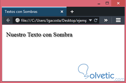 <!DOCTYPE html><html lang="es"><head> <meta charset="UTF-8"> <title>Textos con Sombras</title></head><body> <canvas id="sombra"></canvas> <script type="text/javascript"> var canvas = document.getElementById('sombra'); var ctx = canvas.getContext('2d'); ctx.shadowOffsetX = 2; ctx.shadowOffsetY = 2; ctx.shadowBlur = 2; ctx.shadowColor = "rgba(0, 0, 0, 0.5)"; ctx.font = "20px Times New Roman"; ctx.fillStyle = "Black"; ctx.fillText("Nuestro Texto con Sombra", 5, 30); </script></body></html>Ahora veamos el resultado que podremos apreciar en nuestro navegador:Este ejemplo es muy simple, pero el uso de JavaScript tal vez pueda asustar a más de un diseñador que solo conoce HTML y CSS, sin embargo vale la pena entender este tipo de soluciones para poder tener más recursos para elaborar mejores interfaces para el usuario.