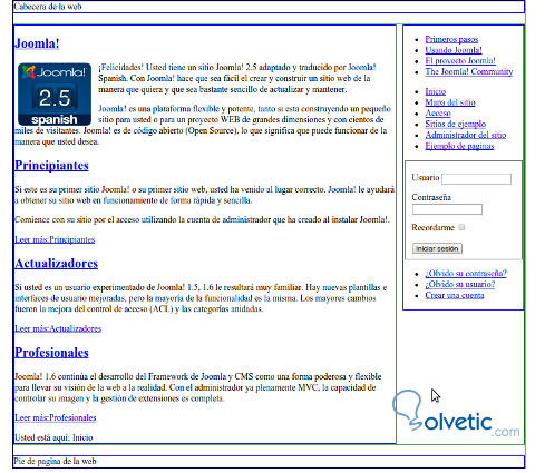 La plantilla instalada y tomando la información por defecto de Joomla en este caso la versión 2.5 en Español, vemos como el módulo de acceso de usuario se ubicó en la posición 3 automáticamente porque así está designado por defecto, mientras que el contenido de la web se ubicó en la posición 1 que es la que tenemos asignada en contenido de la web. Desde el administrador podemos cambiar de posición los distintos elementos que gestionamos.
