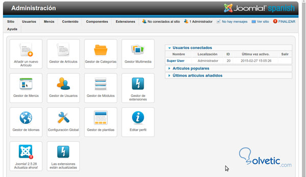 Después de instalar Joomla para nuestro ejemplo, no indicaremos ahora cómo instalarlo, simplemente se puede descargar desde http://www.joomlaspanish.org/