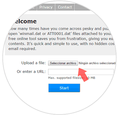 Allí simplemente seleccionamos en archivo .dat en el campo Upload a file y pulsar en el botón Start para iniciar la conversión.