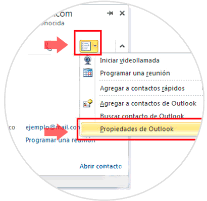 Si volvemos a nuestro Outlook y abrimos la pestaña de Contactos, veremos que ya aparece la misma función que veíamos en Outlook 2010. Podemos ver el antes y el después de crear estos valores. Pulsamos en Abrir propiedades de Outlook.