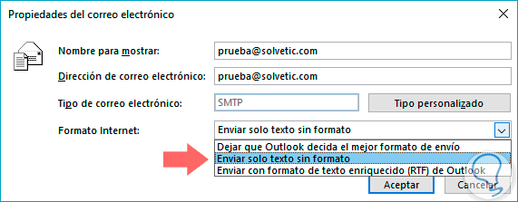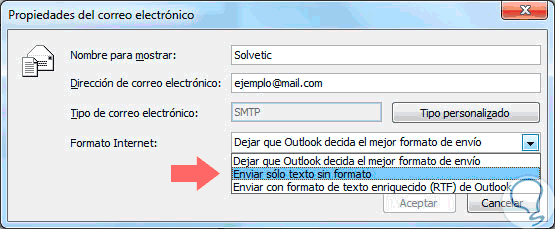 - Dentro de Formato del mensaje, en la opción "Al enviar mensajes en formato de texto enriquecido a destinatarios de Internet:" aquí seleccionamos Convertir a texto sin formato.