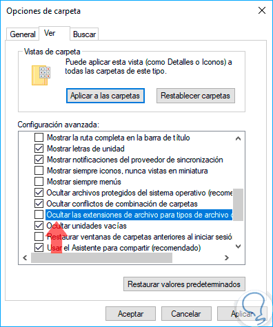 Allí quitar la extensión .dat y establecer la nueva extensión. En caso de que la extensión de los archivos no sea visible debemos ir a las opciones de carpeta y en la pestaña Ver desmarcar la casilla “Ocultar las extensiones de archivo para tipos de archivo conocidos”. Pulsamos en Aplicar y Aceptar.