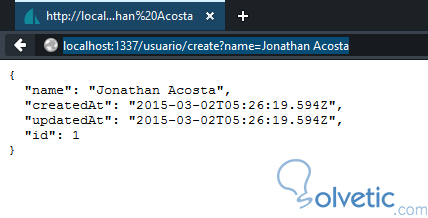 http://localhost:1337/usuario/create?name=Jonathan AcostaEsta acción nos creará nuestro primer usuario en la aplicación, si nos fijamos debemos definir el atributo a incluir utilizando esa notación ya que la misma procesa esos valores como un JSON, veamos la respuesta de Sails cuando ejecutamos esta URL en nuestro navegador: