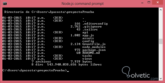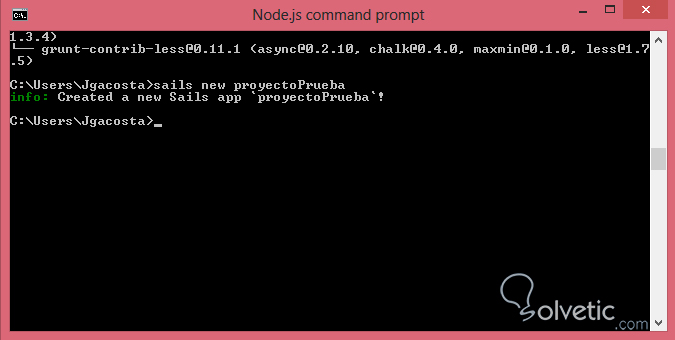 sails new proyectoPruebaLo cual debería darnos un mensaje de éxito con el nombre de nuestra aplicación como podemos ver en la siguiente imagen: