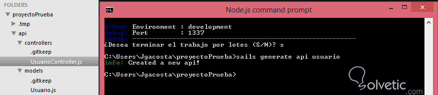 sails generate api usuarioCon lo cual la consola nos responderá con un mensaje de éxito sobre nuestro nuevo api creado, lo cual adicionalmente nos generará dos nuevos archivos relacionados a este proceso, un modelo y por supuesto un controlador.