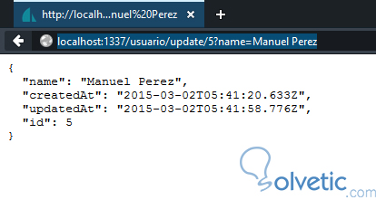 http://localhost:1337/usuario/update/5?name=Manuel%20PerezComo vemos no varía mucho de nuestra operación anterior, lo que es importante destacar es que necesitamos enviar el ID del usuario y el nuevo valor del atributo a modificar, con lo cual Sails nos responderá de la siguiente forma: