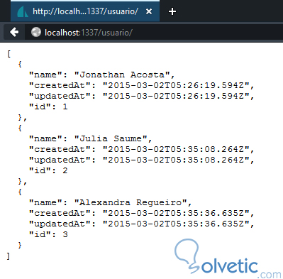 http://localhost:1337/usuario/destroy/5Consultamos nuestros usuarios y vemos como nuestro usuario con el ID 5 ya no existe: