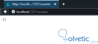 Como podemos ver no tenemos ningún usuario, situación que podemos cambiar rápidamente, Sails.js nos permite crear los valores que necesitamos directamente desde el navegador, para ello colocamos lo siguiente: