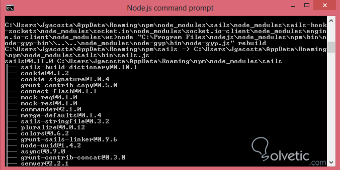 La instalación de Sails.js es tan sencilla como ejecutar una línea de comandos en nuestra consola de Node.js. Abrimos la misma y utilizamos el gestor de paquetes de Node.js para realizar la instalación escribiendo lo siguiente: