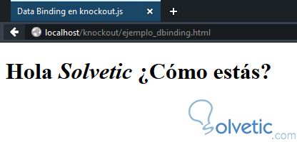 <!DOCTYPE html><html lang="es"><head> <meta charset="UTF-8"> <title>Data Binding en knockout.js</title> </head><body> <h1 data-bind="html: obtenerNombre()"></h1> <script src="js/knockout-3.3.0.js" type="text/javascript"></script> <script> function VistaModelo() { var self = this; self.nombre = 'Solvetic'; self.obtenerNombre = function() { return 'Hola <em>' + self.nombre + '</em> ¿Cómo estás?'; }; }; var vistamodelo = new VistaModelo(); ko.applyBindings(VistaModelo); </script> </body></html>Al llamar a nuestro documento desde nuestro navegador obtenemos el siguiente resultado:Aquí vemos como hemos construido un método que devuelve el nombre y un poco de HTML para darle estilo, esto hace que podamos tener un abanico infinito de posibilidades, pero quizás lo que más resalte es que podemos aplicar un data binding a casi cualquier elemento. Así podemos enviar texto, HTML, etc.