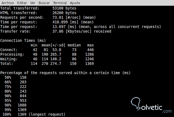 Vemos que respondió 73 peticiones por segundo con un tiempo promedio por petición 410.899 milisegundos y una tasa de transferencia de 37.86 Kbytes/seg, también vemos como varia el tiempo conexión, proceso y tiempo de espera.