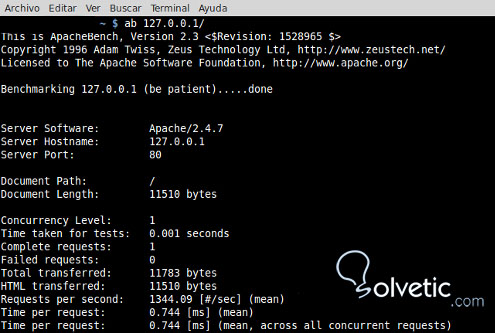 ab -l -r -n 100 -c -k 10 http://www.ejemplo.com/clientes/Esto representa una carga máxima de un sitio web que recibe alrededor de 100.000 visitas al mes que debe soportar y responder el servidor.