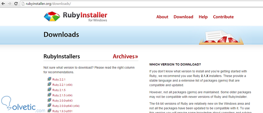 La instalación de Ruby debe ser una de las más sencillas que existen en el mundo de los lenguajes de programación, sobretodo en sistemas Windows que es lo que utilizaremos a lo largo de este tutorial, lo primero que debemos hacer es visitar la página web del proyecto RubyInstaller, aquí encontraremos los descargables de las últimas versiones del lenguaje de programación, en un paquete con su instalador de paquetes llamado RubyGem, que nos permite acceder a un repositorio de complementos extenso. Veamos como luce en la actualidad la sección de descargas de esta web: