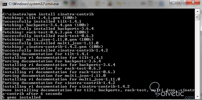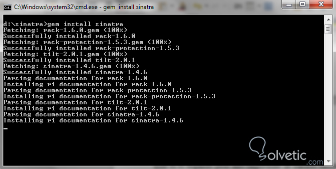 gem install sinatraEsto hará que nuestro sistema descargue todas las dependencias como Rack y otras utilidades, aparte de la documentación oficial para varios de estos componentes, de forma que tengamos ayuda cuando queramos ejecutar algún comando en particular.