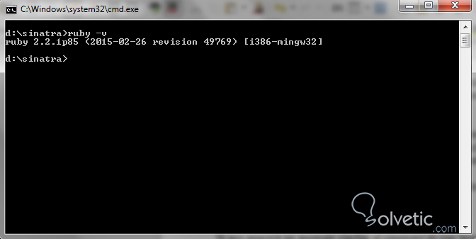 ruby -vSi nos aparece un mensaje similar al siguiente es que hemos hecho una instalación exitosa: