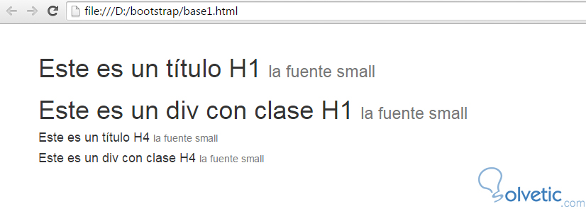 <!DOCTYPE html><html lang="es"><head> <meta charset="UTF-8"> <meta name="viewport" content="width=device-width, initial-scale=1.0"> <!-- Bootstrap --> <link href="bootstrap/css/bootstrap.min.css" rel="stylesheet" media="screen"> <title>Utilizando el archivo Base Bootstrap</title> <style> #estilo { padding-top: 23px; padding-bottom: 24px; padding-right: 51px; padding-left: 55px; } </style></head><body id="estilo"> <h1> Este es un título H1 <small>la fuente small</small></h1> <div class="h1">Este es un div con clase H1 <small>la fuente small</small></div> <h4>Este es un título H4 <small>la fuente small</small></h4> <div class="h4">Este es un div con clase H4 <small>la fuente small</small></div></body></html>