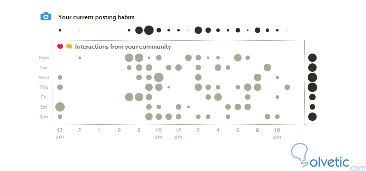 Este gráfico expresa con los círculos oscuros repartidos horizontalmente los momentos donde usualmente posteamos nuestro contenido, los círculos pequeños de color gris es cuando nuestros usuarios están interactuando y los círculos de color gris más grandes que sería el momento adecuado del día para realizar la publicación, esto nos permite lograr ese equilibrio y podemos realizar un calendario de publicación de acuerdo a las estadísticas suministradas por la aplicación.