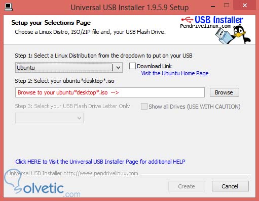 Es importante mencionar que el instalador no es un programa que se instala sino un ejecutable, lo ejecutamos, aceptamos las condiciones y estaremos en el primer paso donde seleccionaremos la distribución a cargar en el USB, en este caso seleccionamos Ubuntu: