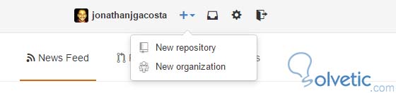 1- Habiendo iniciado sesión nos dirigimos a las opciones de nuestra cuenta y pulsamos el ícono de más (+), se desplegarán dos opciones y pulsamos new repository como vemos en la siguiente imagen: