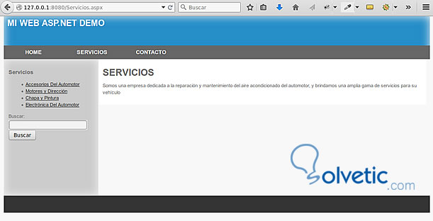 Ejecutamos nuevamente para compilar los cambios y veremos que al pulsar el menú Servicios cambia el contenido de la columna y del bloque contenido:Finalmente definimos la estructura para la página de Contacto. Añadimos la página de Contacto, vamos a Archivos > Nuevo Archivo > ASP.Net Webforms y seleccionamos la opción Formulario de contenido con Codebihind y nos mostrará un dialogo para seleccionar la página maestra a la que enlazará en este caso Home.master