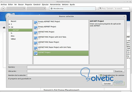 A continuación abrimos MonoDevelop y seleccionamos Nuevo proyecto (En la página de bienvenida o en el menú Archivo), para abrir el diálogo Nueva solución. En la lista de tipos de proyectos de la izquierda amplían la categoría C# y seleccionamos la opción ASP.NET.