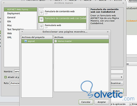 Veamos como queda la web en Monodevelop fon F5 o desde el menú EjecutarAñadimos la página de Servicios, vamos a Archivos > Nuevo Archivo > ASP.Net Webforms y seleccionamos la opción Formulario de contenido con Codebihind y nos mostrará un diálogo para seleccionar la página maestra a la que enlazará en este caso Home.master