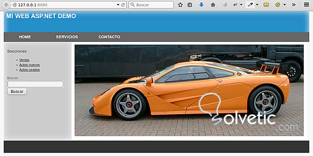 <asp:Content ID="columnaDefault" ContentPlaceHolderID="columnaizq" Runat="Server"> <h3>Secciones</h3> <ul > <li ><a href="#">Ventas</a></li> <li ><a href="#">Autos nuevos</a></li> <li ><a href="#">Autos usados</a></li> </ul> <form runat="server"> Buscar: <asp:TextBox id="tb1" runat="server" /> <asp:Button id="b1" Text="Buscar" runat="server" /> </form> </asp:Content>El bloque de contenido le asignamos una imágen:
