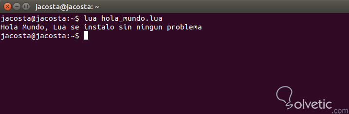 print("Hola Mundo, Lua se instalo sin ningun problema")Nos dirigimos a nuestra terminal a la ruta done hemos creado el archivo y vamos a ejecutar el mismo para verificar que tenemos Lua instalado sin problemas, para ello solo utilizamos la palabra reservada lua y el nombre del archivo, veamos cual es la salida de nuestro programa:Veamos un ejemplo más complejo que permitirá a un usuario introducir data y con una función calcularemos el factorial de un número: