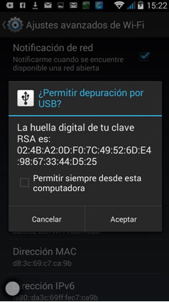 Recuerde permitir la depuración por USB, cuando se conecte por primera vez el dispositivo móvil Android al computador; adicionalmente aparecerá el diálogo. Presione el botón “Aceptar”