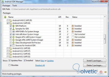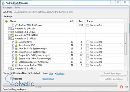 10. Ejecutar el Android – SDK e instalar los componentes asociados al sistema operativo del dispositivo del dispositivo móvil a conectar, en este caso, Android KitKat 4.4.2