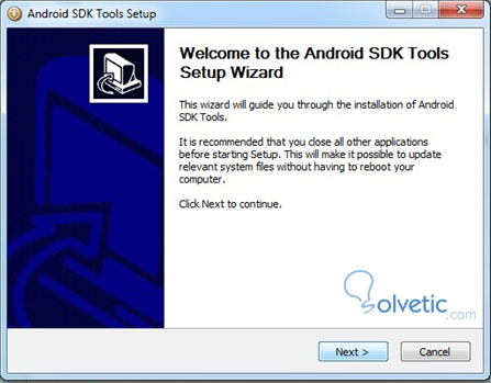 Android SDK: se recomienda la descarga e instalación directa. El archivo pesa alrededor de 106 MB. A continuación el link: http://dl.google.com...1.2-windows.exe