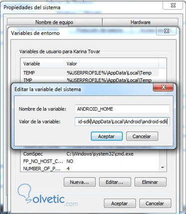 Agregar el nombre de la variable: ANDROID_HOME y el Valor de la variable: C:\Users\”USUARIO”\AppData\Local\Android\android-sdk