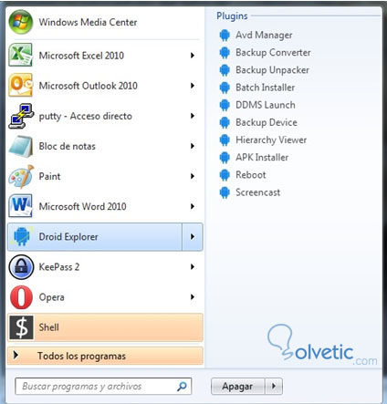 En el menú inicio del computador, ingresar a la herramienta, haciendo click directamente en Droid Explorer.