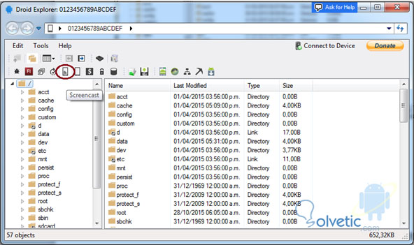 Presione el ícono resaltado “Screencast”; con él se le da la instrucción a la aplicación de desplegar la imagen del equipo móvil.
