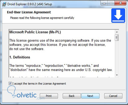 3. Es importante la conformidad de las condiciones y términos de la licencia. Como se mencionó anteriormente, Droid Explorer cuenta con una licencia Ms-PL, la cual aunque sea pública y de código abierto, sus términos y condiciones deben aceptarse. Hacer click en “Next”.