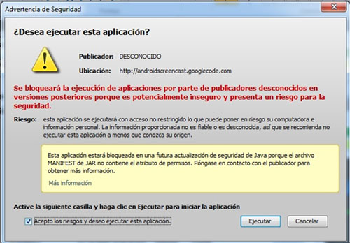 La siguiente imagen aparecerá, debido que Java advierte cuando las aplicaciones no cumplen con sus estándares de seguridad. Es necesario seleccionar la casilla “Acepto los riesgos y deseo ejecutar esta aplicación”. Luego presione el botón “Ejecutar”.