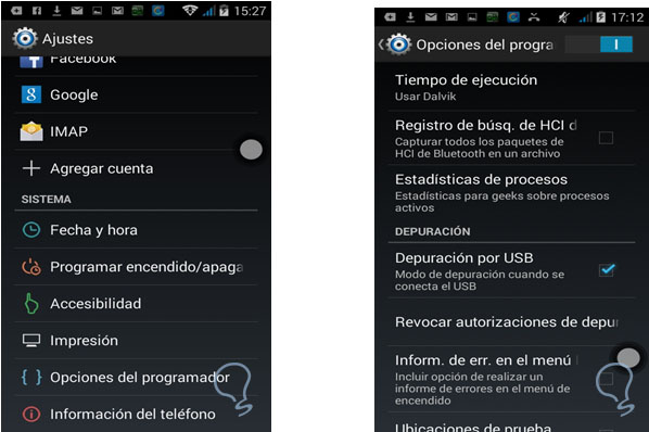 Activación del modo Depuración del USB: Se puede verificar en el dispositivo móvil en: