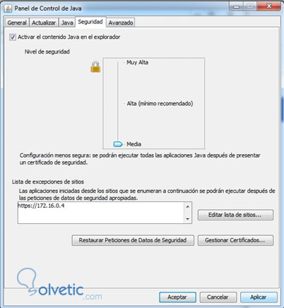4. Revisar en la pestaña de seguridad y bajar el nivel de seguridad a Media. Luego presione el botón “Aplicar”.