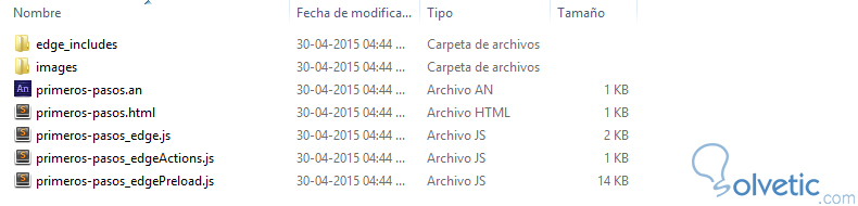 Si estamos familiarizados con el desarrollo de aplicaciones web podremos ver algunos archivos con extensiones conocidas, veamos la función de cada uno de estos dentro de un proyecto de Edge Animate: