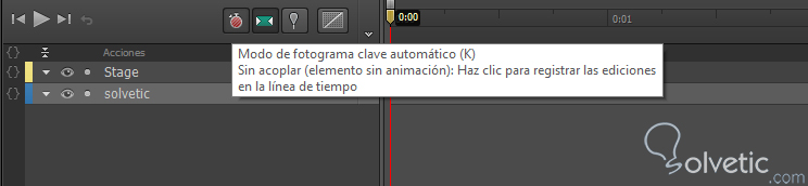 3- Ahora nos dirigimos a nuestra Línea de tiempo y verificamos que el contador de reproducción se encuentre en 0:00 para empezar con nuestra animación. Aquí es donde viene la parte interesante y es donde debemos poner máxima atención, primero debemos verificar que el modo de fotograma clave este presionando así como el modo de transición automático, los cuales podemos ver en la siguiente imagen: