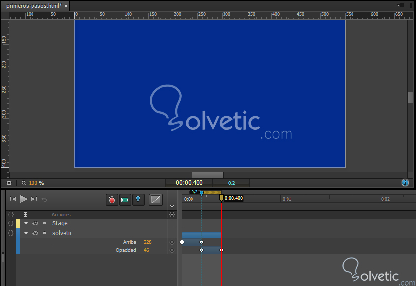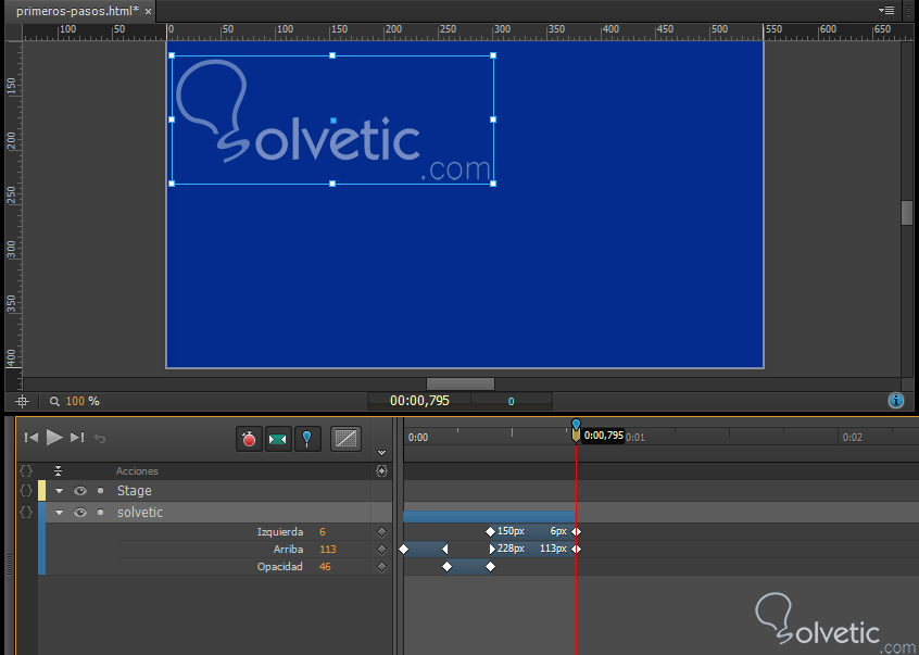 7- Guardamos nuestro trabajo y presionamos la tecla de espacio para visualizar nuestro animación, si todavía no estamos conformes podemos movernos por las transiciones que están representadas por el color azul en nuestra Línea de tiempo y modificamos los valores o si lo deseamos el tipo de transición.