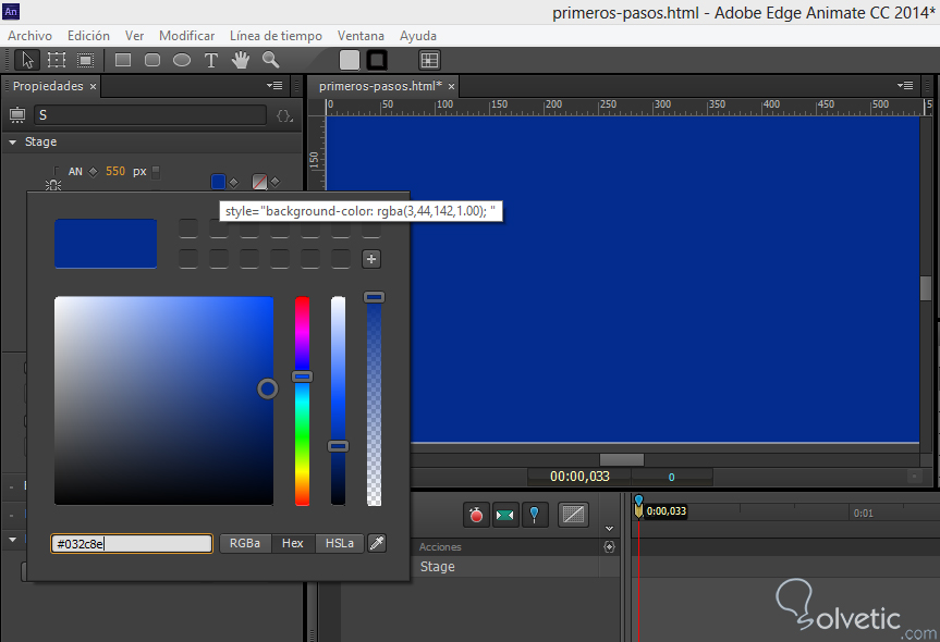 1- Vamos a crear un nuevo proyecto con la opción nuevo archivo en el caso que hayamos cerrado en el que estamos trabajando para entender la estructura y los elementos dentro de la herramienta. Cuando comenzamos un proyecto, nuestro escenario se encuentra en blanco, esto lo podemos cambiar en las propiedades de stage del lado izquierdo de la pantalla, para ello presionamos el recuadro de color blanco y escogemos un color de nuestra preferencia o en el caso que poseamos un color en notación hexadecimal lo podemos incluir como vemos en la siguiente imagen: