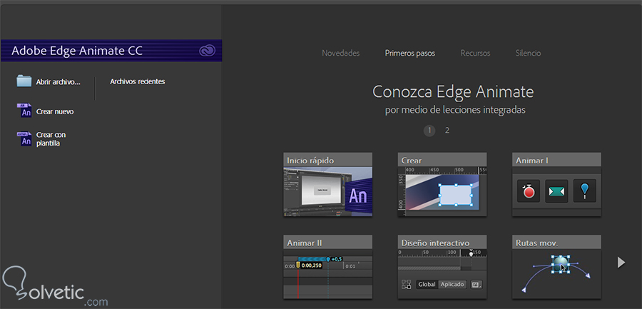 Lo anterior puede sonar un poco complicado, ¿Cómo es posible tener una herramienta que me ayuda a crear animaciones en esas tecnologías, sin conocimientos de programación? No es tan complicado como parece, pero antes debemos conocer la herramienta y que contamos para poder trabajar con ella, para ello vamos a ejecutarla y seremos recibidos por la pantalla de inicio que debe verse de la siguiente forma: