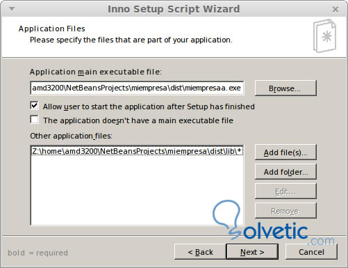 Luego deberemos asignar nuestro archivo ejecutable y sus dependencia o librerías, aquí tomamos como ejemplo un software que habíamos desarrollado con Java y convertido a exe con Launch4j en el tutorial Netbeans y Sqlite en tres Capas – Parte II