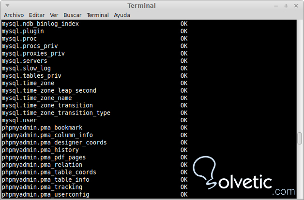 Aquí comprobamos todas las tablas de phpmyadmin utilizando el siguiente comando: