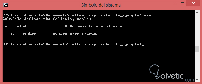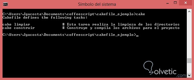 El ejemplo anterior fue solo para comprobar que hacía el compilador, pero nuestro archivo Cakefile no debe poseer ninguna extensión. Podemos adicionalmente ver que tareas tenemos disponibles con el comando cake en la consola de comandos, veamos como luce: